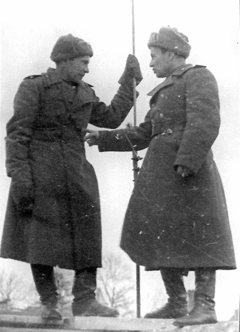 (27 из 112) В. А. Беручан (справа) на строительстве висячего моста через р. Одер 2 марта 1945 г.
