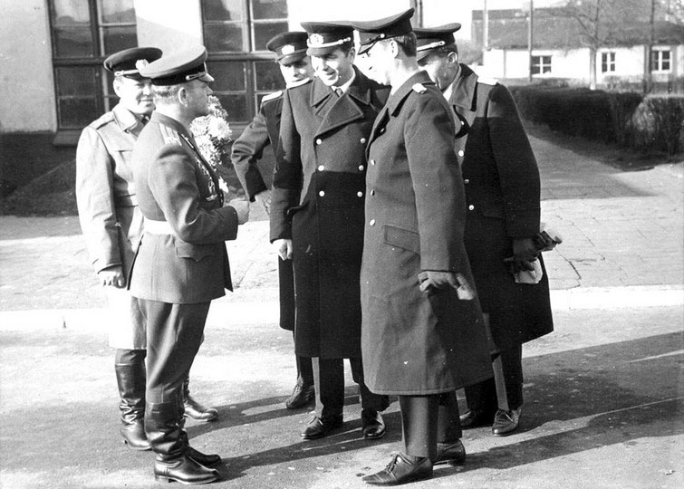 (11 из 23) 7 ноября 1969 года. Гв. подполковник Алексеев А. Н. на плацу 10-го отб принимает поздравления с праздником от офицеров ННА ГДР. Фото из архива Алексеева А. Н. ©