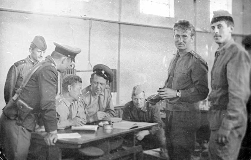 | (3 из 38) В 1970 году 10 отб был перевооружен танками Т-55. На снимке: прием-сдача формуляров и прочей танковой документации в спортзале 10 отб. Стоящий у стола офицер в рубашке – начальник штаба 10 отб капитан Христич. Из архива Г. А. Ананьина. © |