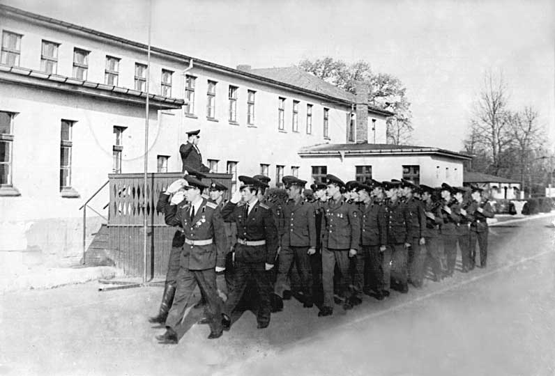 | (9 из 37) Идет 1-я танковая рота. За командира роты ст. л-т Вовкогон, за ним л-т Ануфриев (скончался в сентябре 2013 г. Вечная память!). На трибуне командир 10 отб п/п-к Аксенов М. Г. Из архива В. И. Береста. © |
