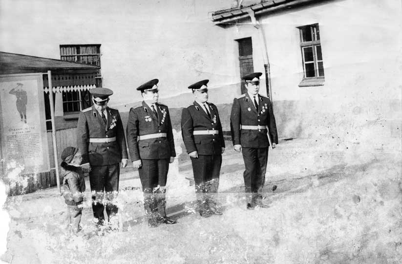 (10 из 37) Слева направо: командир 1 тр ст. л-т Сулимовский, замполит м-р Дроздов, зам. по тылу м-р Звонков, ???. Из архива В. И. Береста. ©