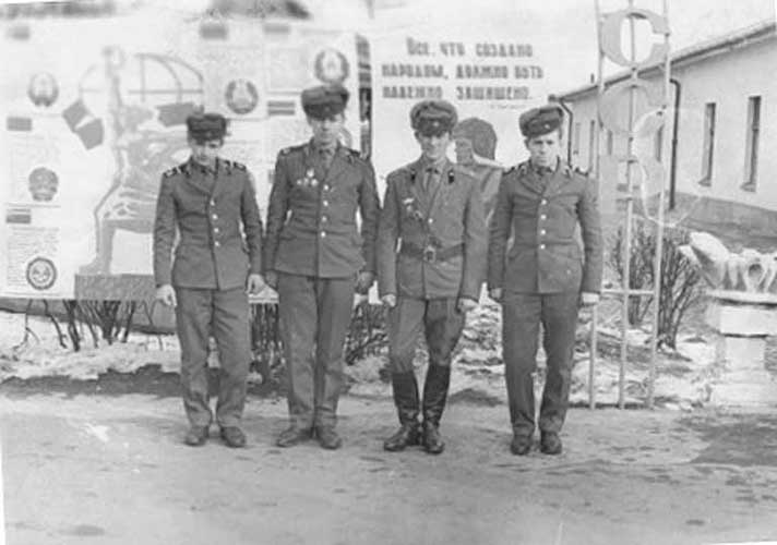 (13 из 37) Командирский экипаж. Слева направо: наводчик орудия Белянинов, заряжающий Периков, ком. взвода л-т Ануфриев, Михаил Берест. Из архива В. И. Береста. ©