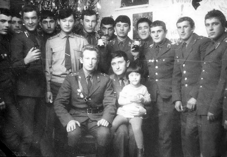 (2 из 31) Эберсвальде. Новый 1975 год в танковом батальоне 81-го гв.мсп. Сидят ст. л-ты Пономаренко и Демишев. Среди наших бойцов стою я и л-т Сивуха. Из архива В. Ф. Ким. ©
