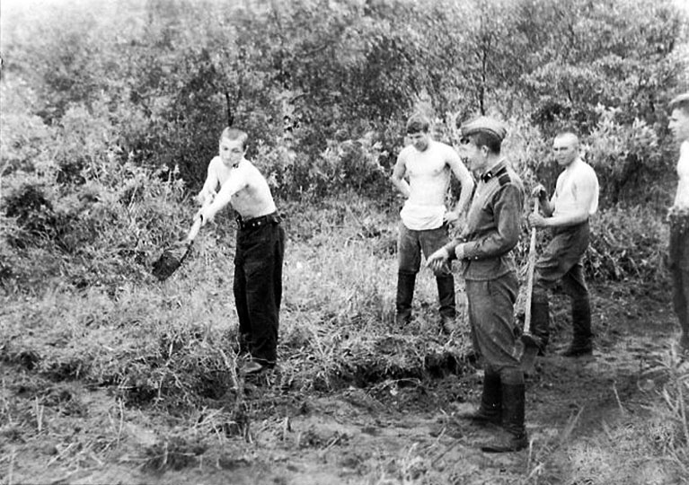 (1 из 8) Крайний слева — ефрейтор Козлов, за ним — ефрейтор Балбеков(?), в центре С. Мананников, крайний справа (по обрезу фото) — Толик Ададимов. Из архива С. Мананникова. ©