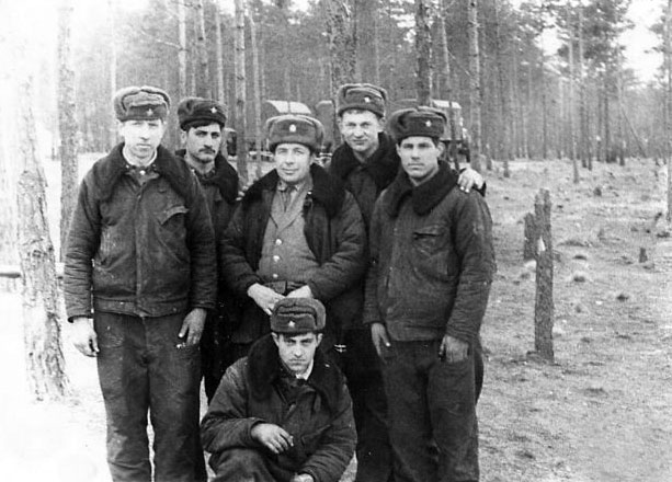 (3 из 8) Полигон Мюльрозе. Слева направо: И. Коростылев(?), С. Мурадов, прапорщик Х. Айнетдинов, С. Мананников, Донсков. Сидит М. Лось. Из архива С. Мананникова. ©