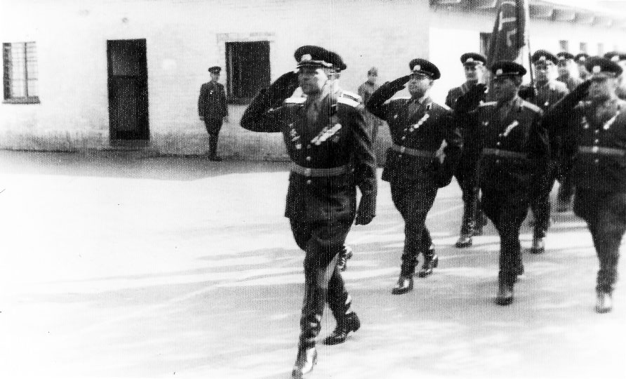 (3 из 6) День Победы — 9 мая 1966 года. Территория Берлинской бригады. Впереди командир 10 отб гв. п/п-к Мика В. Я. Крайний справа начальник штаба м-р Мяндин. Из архива Анны Мика.©