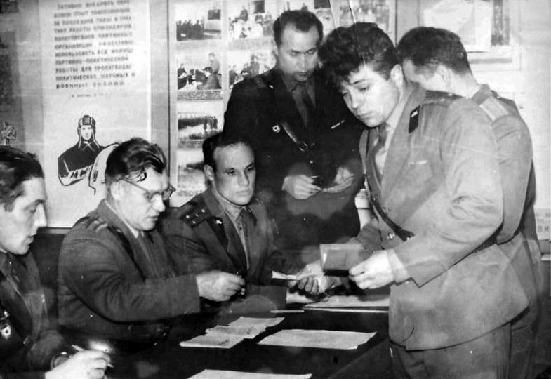 | (7 из 9) Уплата партвзносов (предположительно). Слева Жуков, рядом майор Звонков. На заднем плане стоит Пинчуков В. А. На переднем плане командир 1 тр лейтенант Видинеев. Из архива В. А. Пинчукова. © |