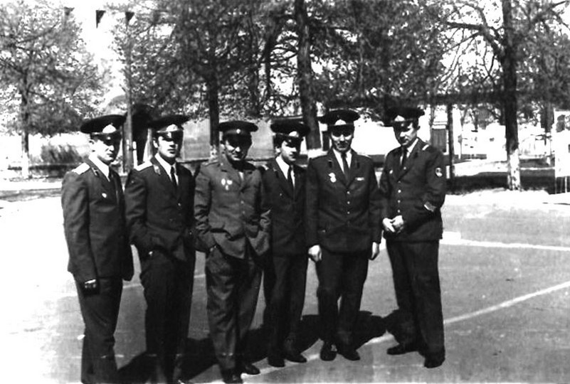 (9 из 9) Группа офицеров и сверхсрочников 10-го отб на фоне бункера. Справа здание клуба. Второй слева начфин Юрий Воронович. Крайний справа Пинчуков В. А., рядом Жуков. 1972 год. Из архива В. А. Пинчукова. ©