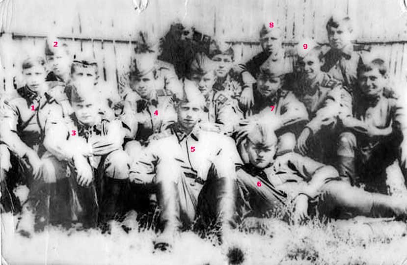 | (4 из 7) 5-я танковая рота, весна 1975 г. 1 – Юра Пахомов, заряжающий 2 – Волынов(?), механик-водитель, 3 – Володя Родичев, заряжающий, 4 – Саня Черняев, механик-водитель, 5 – Петя Каверин, наводчик, 6 – Страшнюк, заряжающий, 7 – Серега Шинкаренко, командир танка, 8 – Славик Шаповалов, заряжающий, 9 – я. Из архива В. В. Толстых. © |