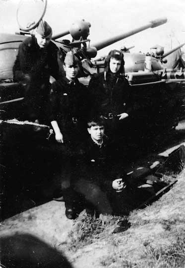 | (5 из 7) На обороте этой фотографии надпись: «До дембеля 140 дней». Старики 5-й танковой роты. На броне заряжающий Вовка Родичев, на корточках командир танка Серега Шинкаренко, механики-водители Саня Черняев (в пилотке) и я. Июнь 1975 г. Из архива В. В. Толстых. © |