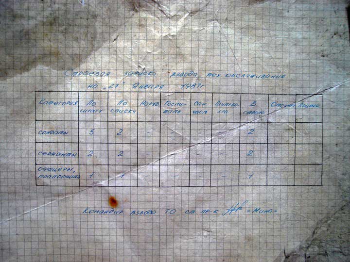 (116 из 144) Строевая записка старшего прапорщика Мина, командира взвода ТО. Где сейчас старший прапорщик Мина? Думал ли он, составляя эту записку, что я найду ее в груде мусора спустя столько лет. P.S. Недавно откликнулся его сын Юрий. Командир взвода ТО старший прапорщик Мина Владимир Степанович жив и здоров, отметил свое 70-летие и в подарок на свой юбилей получил эту фотографию. Все-таки чудеса бывают! |