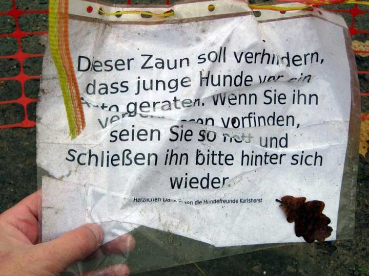 | (66 из 76) Выходя тем же путем заметил прикрепленную к сетке бумажку. Но (по Галичу) «...написано на ней не по-русски, а по-ихнему я плохо читаю...» Уже потом дочка прислала перевод. Собачники Карлсхорста, выгуливающие здесь собак, убедительно просят закрывать проход сеткой, чтобы собачки не выбегали на проезжую часть улицы. |
