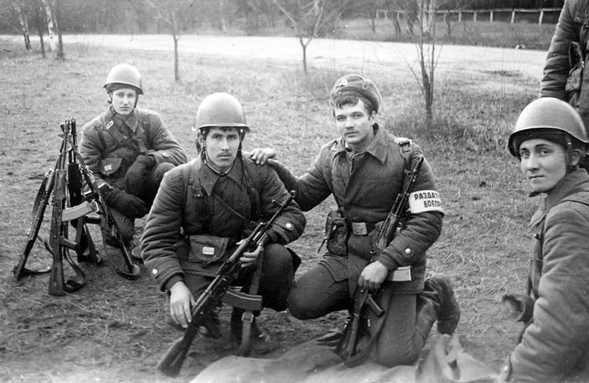 (5 из 47) Это мы на полигоне: сержант Кавун, рядовой Смольянинов, я, а вот этого паренька не помню. Кажется, из третьего взвода. Из архива А. Л. Галиновского. ©