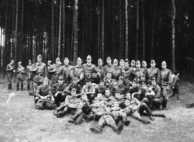 (10 из 47) Лето 1982 г. 3 РСС. Слева, на заднем плане, «пауки» из взвода связи — слева направо сверху вниз: Миша Афонин, Ярошко, Юра Бутузов, Юра Сычёв, Юра Вербило, Серёга Бабкин, Серёга Исаков, Коля Шишкин, Серёга Байбаков, Вова Гуров, Юра Бондаренко, Славик Руденко, Толик Ширинкин, Кизяев, Вася Матей. Второй ряд: Саша Горелов, я, Саша Демьяненко, Саша Станкевич, Ахмадулов, Андрей Енин, Витя Гуторов, Саша Пильгун, Игорь Афонин, Витя Бекешев, Юра Пивоваров, Молчанов. Лежат: Федя Коновалов, «паук» из взвода связи, Макаров, Вова Купка, Саша Жадан, Вова Кавун. Первые трое: Вася Жуков, Стадниченко, ? Из архива А. Л. Галиновского. © |
