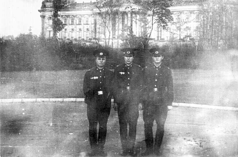 (30 из 44) П.Головко, В.Шкурский, М.Дениченко возле Рейхстага. Из архива П. Н. Головко. ©
