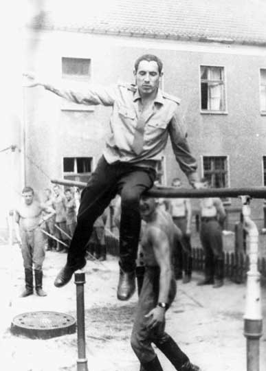 (7 из 173) Физподготовка. Лейтенант Данько В. П. показывает упражнение на брусьях. Из архива В. А. Попова. ©
