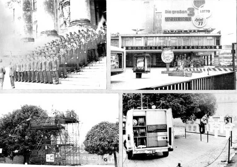 (27 из 53) Я, конечно, извиняюсь за качество фотографий, но не всегда было время их держать в закрепителе — и так сойдет! На нижнем левом фото смотровая площадка, с которой можно было посмотреть на Восточный Берлин из «логова империалистов». На верхнем левом фото американцы тоже готовятся к дембелю и фотографируются на память у Рейхстага. Справа вверху Будапештер штрассе, 50. Внизу — кладбище «перебежчиков» в Западный Берлин возле Рейхстага. Из архива В. И. Толстова. © |