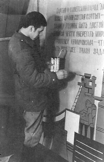 (31 из 183) Аксенов Николай оформляет Ленинскую комнату в новой казарме. Осень 1969 года.