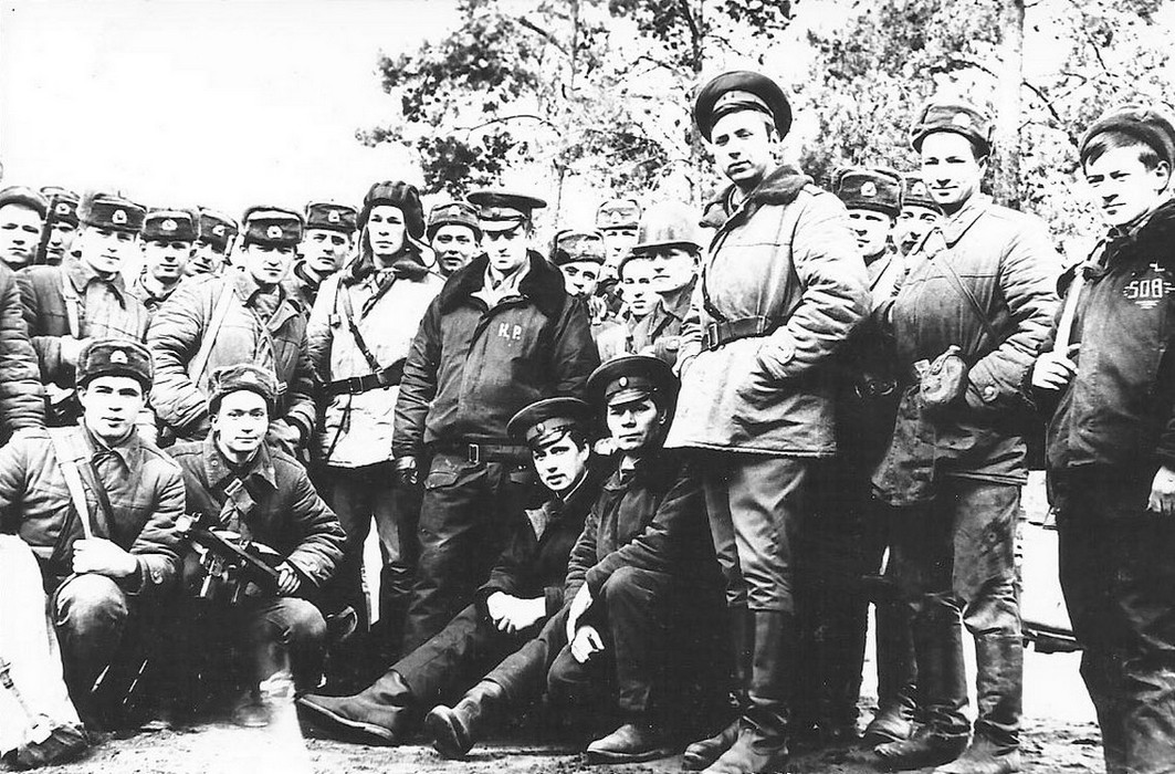 | (35 из 136) Личный состав 1 мср на полевом выходе. В центре ст. лейтенант Е. Шепель (в шлемофоне) и ст. лейтенант М. Сирык, сидят прапорщики Н. Миколенко (слева) и Б. В. Тухватуллин, рядом стоит ст. лейтенант И. Ю. Гришин. Из архива И. Ю. Гришина. © |