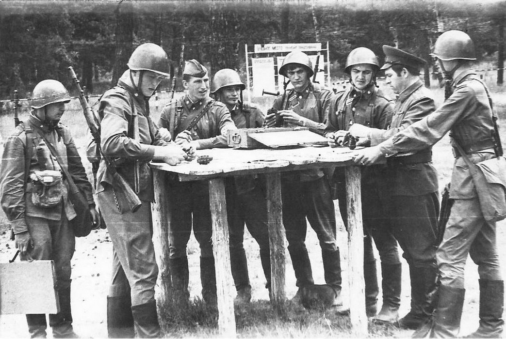 (56 из 136) Парторг батальона майор Новиков проводит занятие по подготовке к метанию боевых гранат.