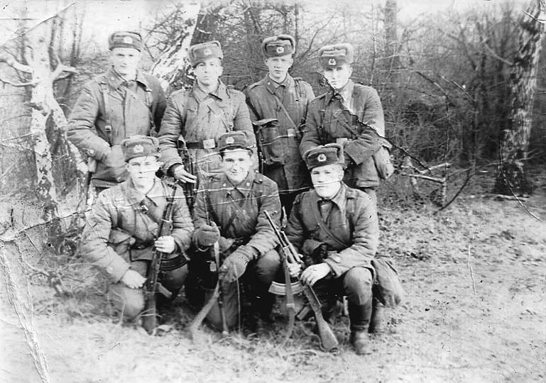 (19 из 36) Отделение из взвода А.В.Тарабакина. Стоят: Сасин, Ващило Т., не помню, Жуковский Л. Сидят: Щеблыкин Т., Гусарь, Терентьев К. Из архива П. П. Голубева. ©