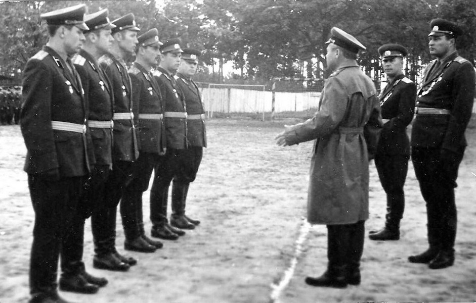 | (6 из 84) Штансдорф. Крайний справа – командир 54 отб подполковник А. Д. Рыкунов, рядом с ним командир 178 омсб В. К. Петров. В шеренге офицеров второй слева – командир роты 65 отб капитан Эдуард Мочалов, за ним командир взвода связи 65 отб (фамилия неизвестна), за ним (предположительно) командир роты 178 омсб И. Н. Болотаев. Из архива В. К. Петрова. © |