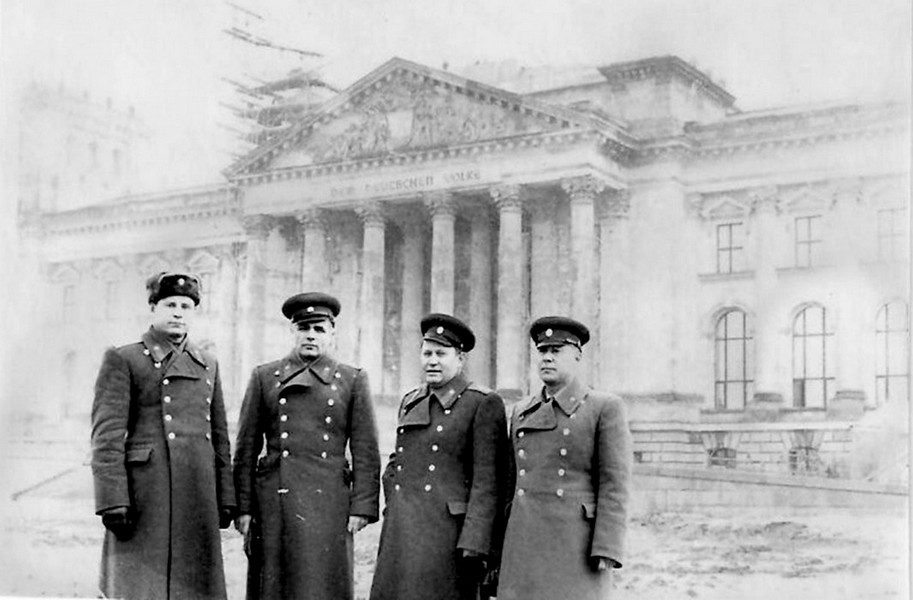 (79 из 84) Выезд на рекогносцировку в Западный Берлин. Комбаты и начальники штабов батальонов бригады у рейхстага. Из архива В. К. Петрова. ©
