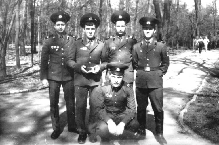 (13 из 19) Прогулка по Берлинскому зоопарку. Слева направо: Новоселов, Мерцеха, я, Шахгириев, сидит Селедец. Из архива В. Старичка. ©