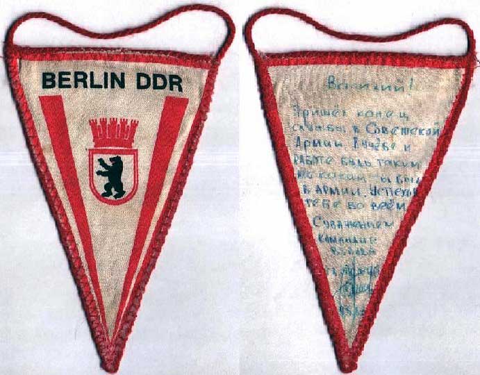 | (16 из 19) Из всех поощрений этот вымпел, подаренный мне командиром взвода Калашниковым Владимиром Петровичем в день моего отъезда из Берлина, для меня самый ценный! Из архива В. Старичка. © |