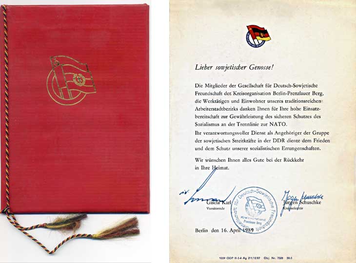 (7 из 8) Обложка и грамота с благодарностью от шефов батальона — управления полиции района Берлин–Пренцлауэр Берг. Из архива Ю. Б. Заруцкого. ©