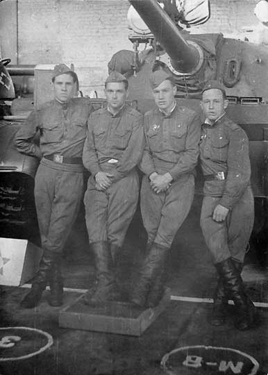 | (10 из 13) У танка Т-54А слева направо: неизв., механик-водитель Гончаренко Слава (г. Рыбница, Молдавия), наводчик орудия Еремчук Николай (г. Барановичи, Белоруссия), механик-водитель Шулепов Дмитрий (Городец, Горьковская обл.). Из архива Д. Н. Шулепова. © |