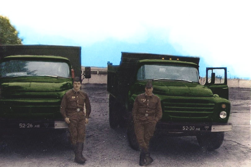 | (11 из 12) «Транспортный отдел» взвода материального обеспечения. Справа — Рудольф Зверев ( Мончегорск ) — незаменимый аккумуляторщик и вообще специалист широкого профиля! Из архива О. А. Кобылянского. © |