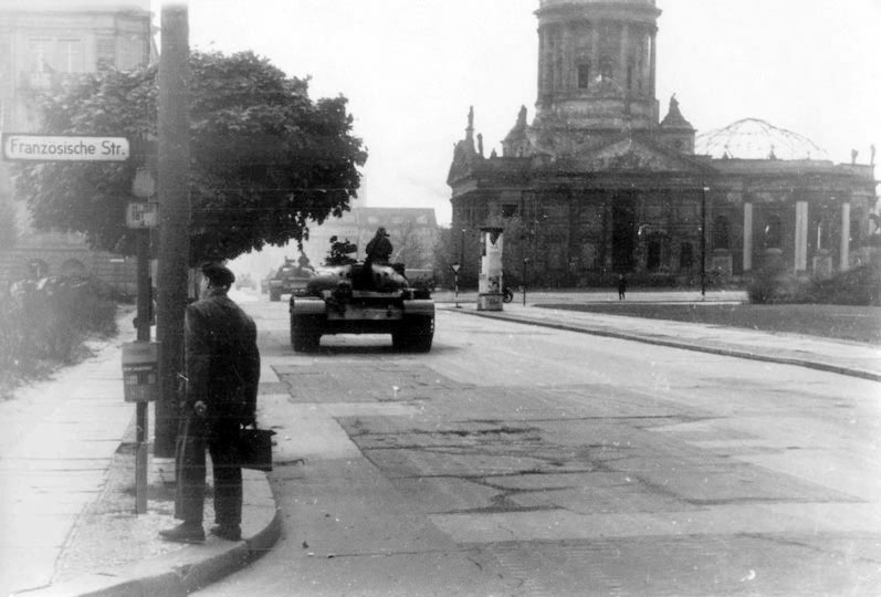 | (3 из 21) Танки 3-го танкового батальона выдвигаются на позиции по Маркграфен штрассе в сторону Францёзише штрассе (справа виден памятник Ф. Шиллеру перед зданием театра, на заднем плане — Немецкий собор). Из архива Анны Мика.© |