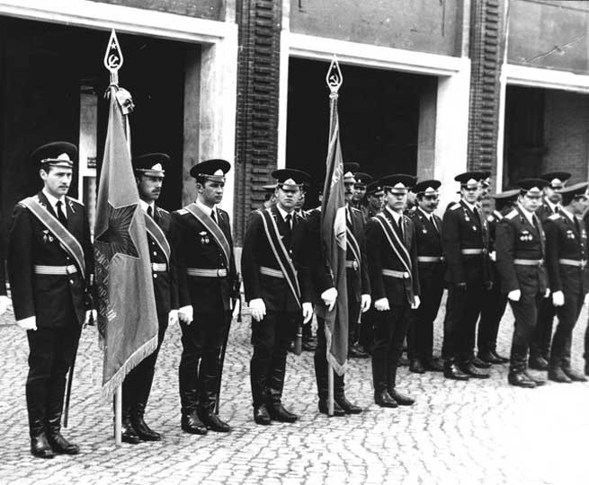 (6 из 8) Знаменная группа полка. Справа — управление полка. 9 мая 1983 года. Из архива В. Г. Полищука ©