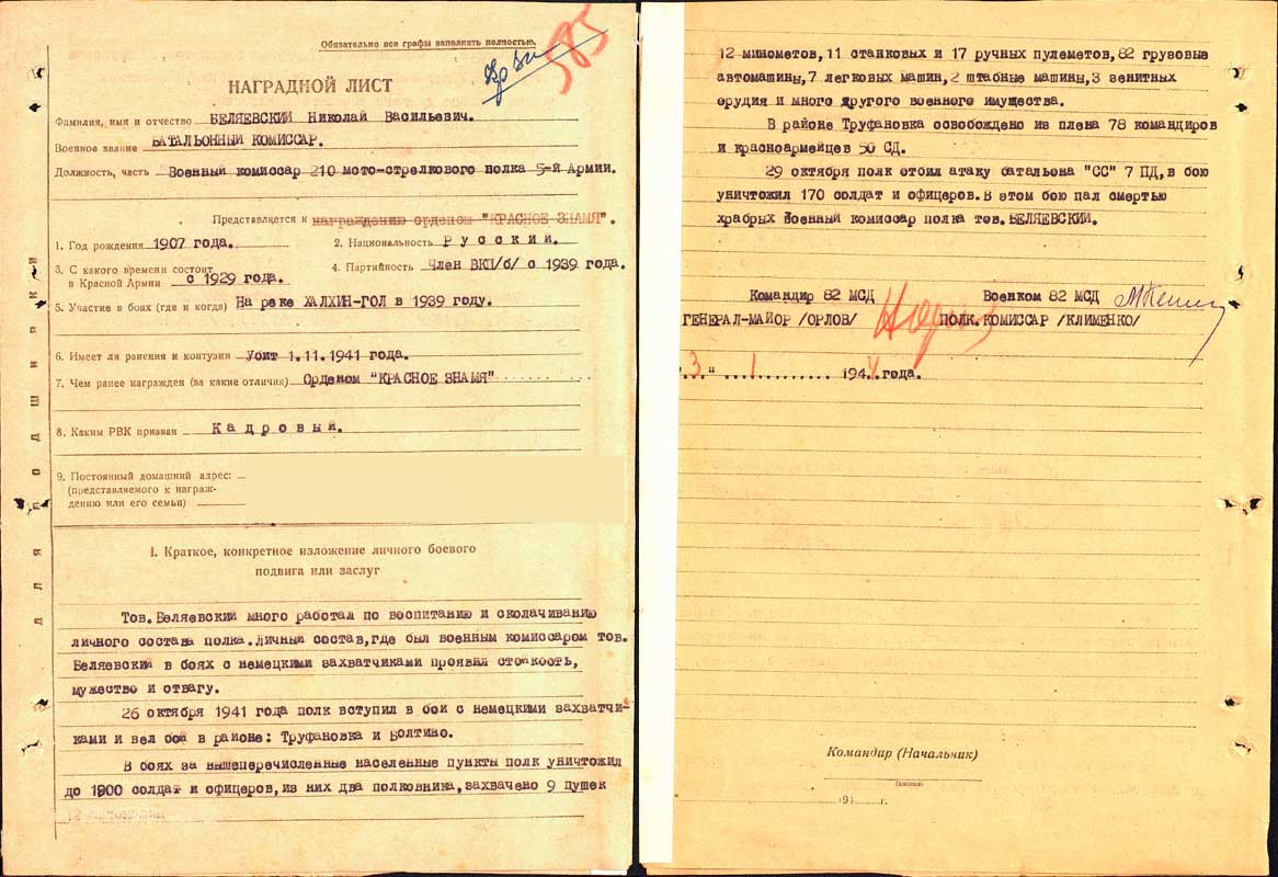 К середине октября 1941 г. под Москвой сложилась крайне тяжелая обстановка. 18 октября наши части оставили Можайск, после чего гитлеровцы подошли к станции Дорохово. Прибывшие из резерва Ставки 82 мотострелковая дивизия под командованием полковника Г. П. Карамышева и 25 танковая бригада, получив задачу во взаимодействии с 22 тбр атаковать врага в Дорохове, практически с хода вступили в бой. В период с 26 по 29 октября дивизия успешно осуществила Дороховскую операцию и нанесла крупное поражение противостоявшей ей 7 пехотной дивизии немцев. В результате первого дня наступления было освобождено 12 населенных пунктов, противник был отброшен на 14 км. В этих боях пал смертью храбрых военный комиссар 210 мсп Беляевский Н. В., прошедший вместе с полком сражения на Халхин-Голе.