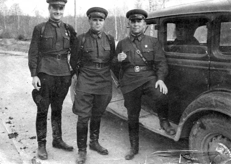 | (12 из 25) Командование 6-го гв. мотострелкового полка: слева направо начальник штаба Старовойт Г. В., комиссар Юрасов Г. И., командир полка Кузьмин Е. С. и водитель Мартыненко после окончания похода. Предположительно 26 июня 1942 года. Из архива М. А. Еремич. © |
