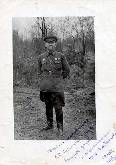 | (19 из 25) Один из последних снимков Евстигнея Сергеевича Кузьмина. На фото надпись: «Гвардии полковнику Е. С. Кузьмину в знак большой дружбы от фотокорреспондента ТАСС Дм. Чернова. 1942 г., октябрь». Из архива М. А. Еремич. © |