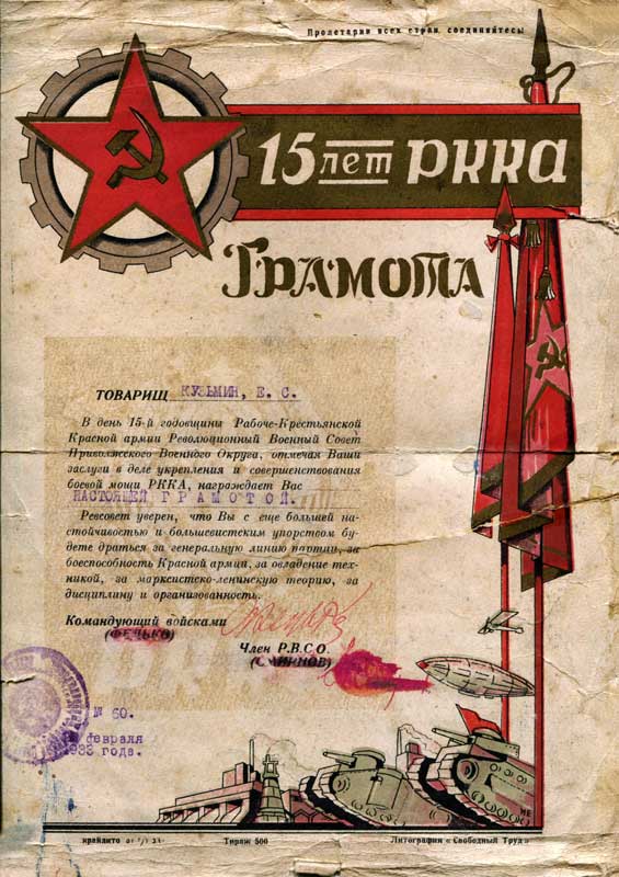 (21 из 25) Грамота от командующего Приволжским военным округом И. Ф. Федько в честь 15-летия РККА.