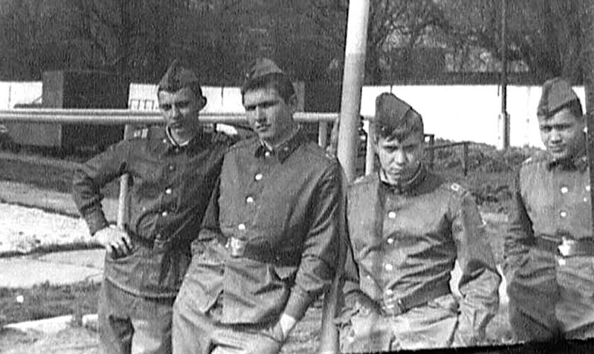 (12 из 47) Спортгородок. Слева направо: Брикун Петя, я, Пеженков Миша, Скрипников Вася (танкист).