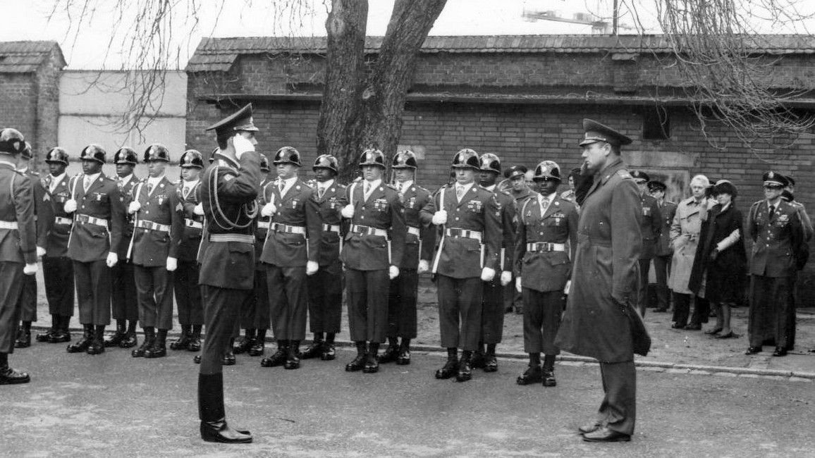 (13 из 37) Шпандау, 1 декабря 1984 г. Начальник караула ст. лейтенант С. В. Давыдов докладывает командиру бригады подполковнику В. И. Марченкову.