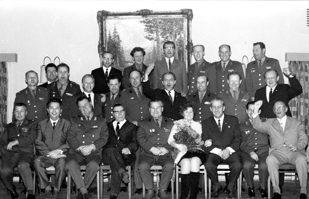 (20 из 23) Встреча офицеров бригады с немецкими товарищами, 1970 г. Сидят: командир 178 омсб В. К. Петров (крайний слева), Ю. П. Петкевич (третий слева), заместитель командира бригады Д. Ф. Карпенко (в центре). Второй ряд: заместитель командира бригады Н. И. Карабут (крайний слева), рядом с ним командир 133 омсб Н. П. Фомин, через одного командир 54 отб В. Г. Концедалов, рядом командир 53 отб М. Н. Кириенко, офицер оперотдела штаба бригады А. А. Ларионов (второй справа), офицер рядом с ним не установлен. Верхний ряд: начальник политотдела бригады С. Ф. Король (второй слева), начальник отделения кадров Г. М. Усенко (третий справа), начальник штаба 154 омсб В. М. Киреенков (второй справа), крайний справа офицер не установлен. Из архива Н. Ю. Петкевич. © |