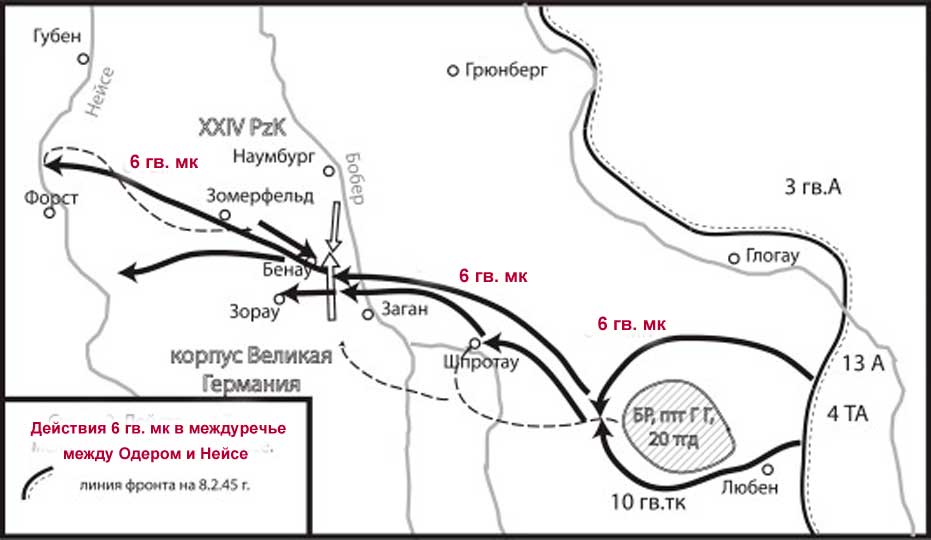 Несмотря на сжатые сроки подготовки наступления, 6 гв. мк в 11.45 начал атаку. К исходу дня части корпуса продвинулнсь на глубину 3-4 км, выйдя передовыми частями на рубеж р. Орс в районе Войновский.