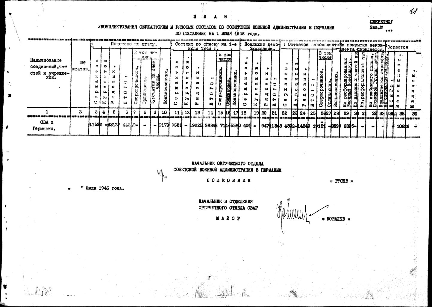- • План укомплектования СВАГ сержантским и рядовым составом по состоянию на 01.07.46 г. Подлинник. ГАРФ, ф. 7317, оп. 49, д. 21, л. 61.