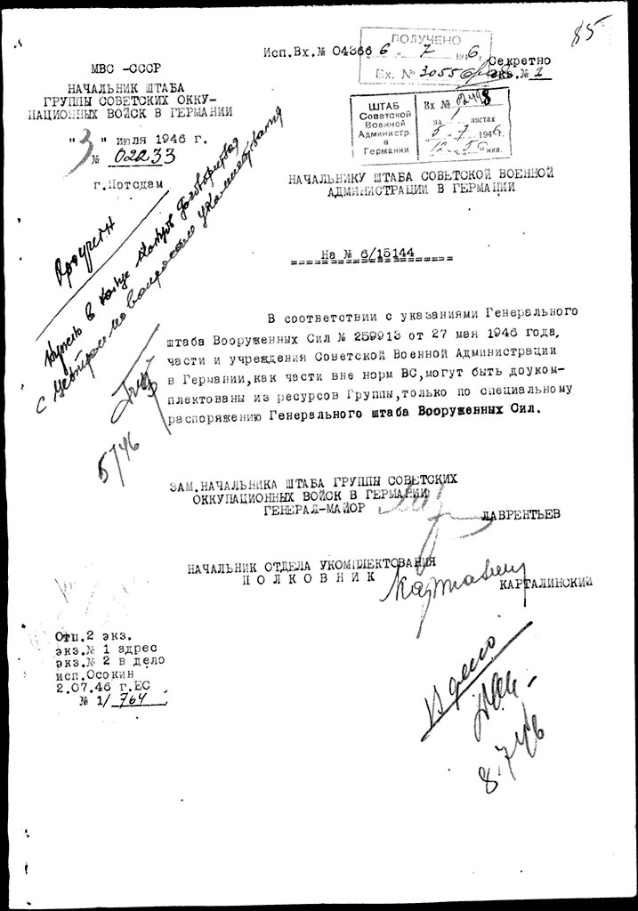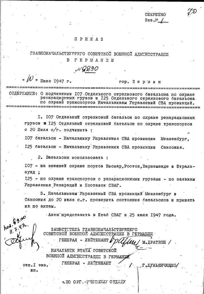 - • Приказ Главноначальствующего СВАГ № 0230 от 10.07.47 г. о подчинении 107 осборг УСВА Мекленбург и 125 осбот УСВА Саксония. Подлинник. ГАРФ, ф. 7317, оп. 7, д. 48, лл. 70-71.