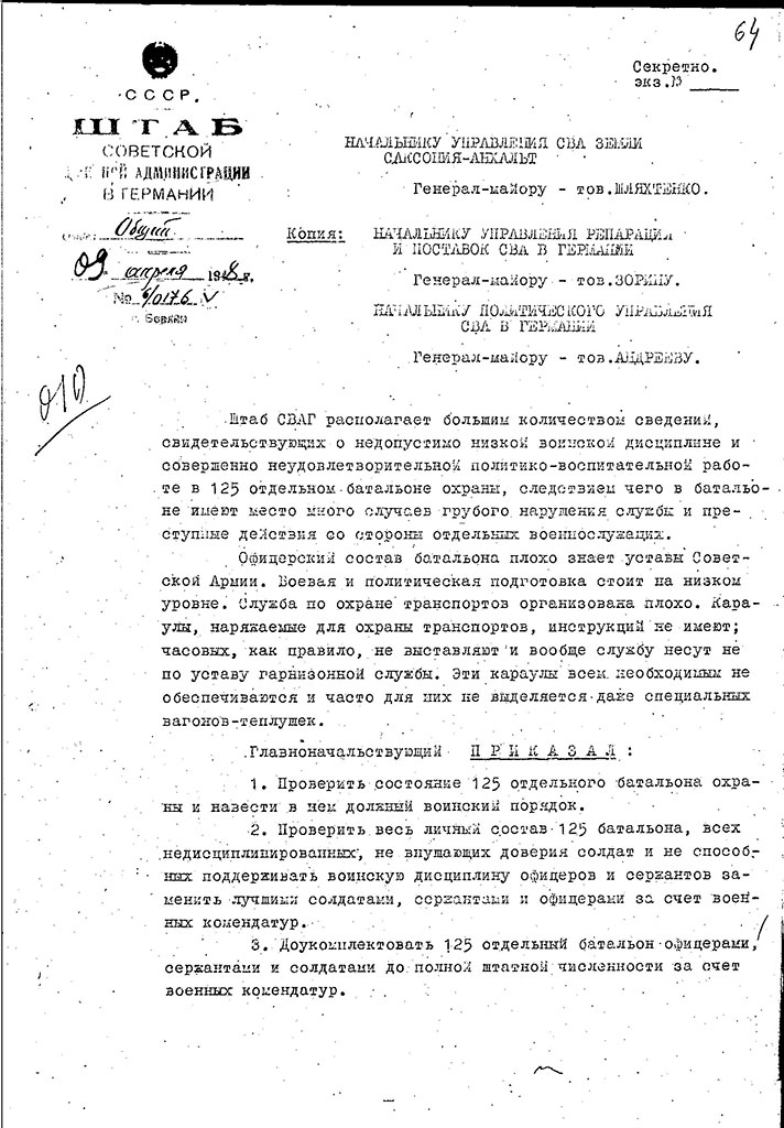 - • Директивное указание начальника Штаба СВАГ № 6/0176 от 09.04.48 г. начальникам УСВА земли Саксония-Ангальт, Управления репараций и поставок, Политического управления о мероприятиях по предотвращению фактов нарушения воинской дисциплины в 125 осбот. Подлинник. ГАРФ, ф. 7317, оп. 7, д. 68, лл. 64-65.