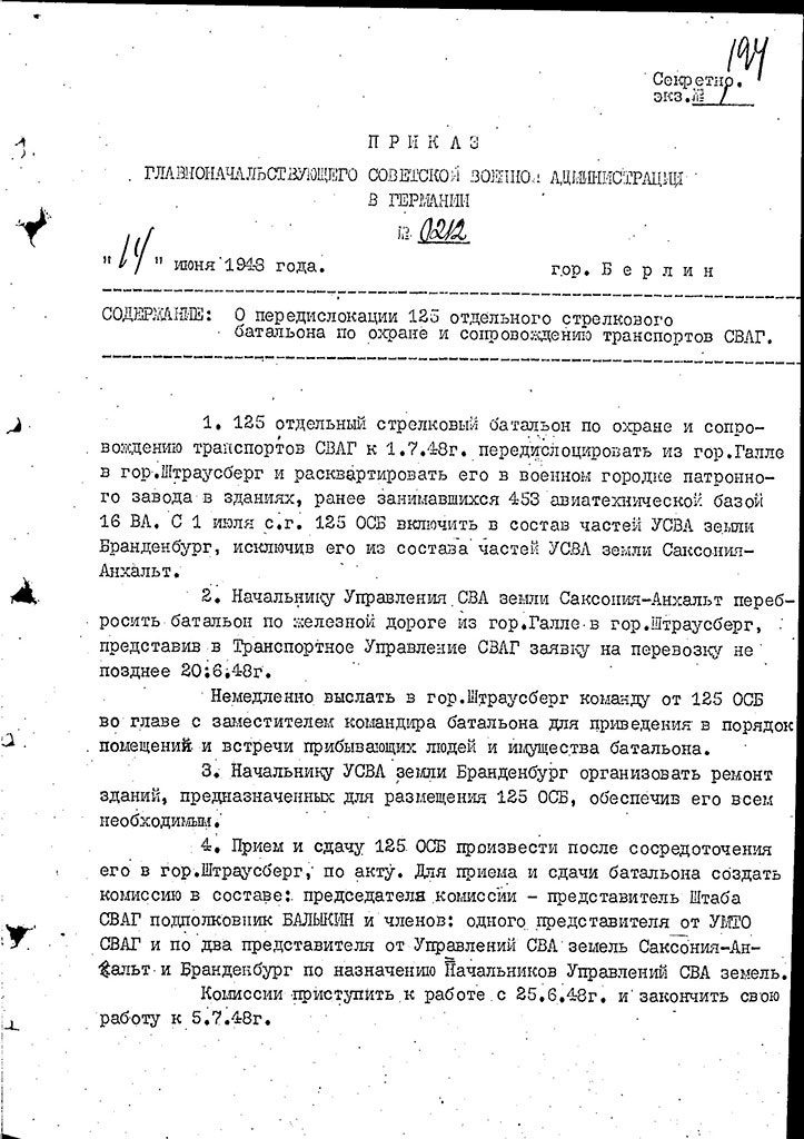 - • Приказ Главноначальствующего СВАГ № 0212 от 14.06.48 г. о передислокации 125 осбот. Подлинник. ГАРФ, ф. 7317, оп. 7, д. 73, лл. 194-195.