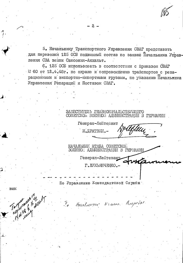 В короткий срок Управлением репараций и поставок были подготовлены проект приказа и инструкция по обеспечению перевозок, которые после согласования с начальником ВОСО ГСОВГ и начальником Транспортного управления СВАГ были переданы на утверждение Главноначальствующему СВАГ. Так появился приказ № 0339 от 27.09.47 г об упорядочении перевозок репарационных и импортных грузов из Советской зоны оккупации Германии в СССР.