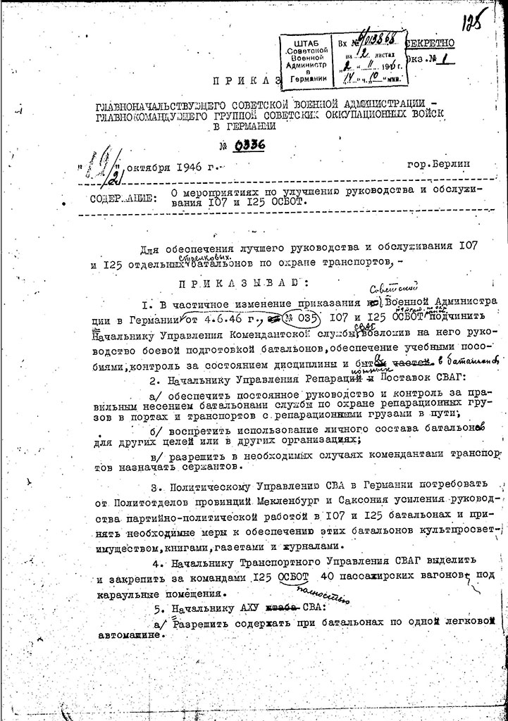 Приказом Главноначальствующего СВАГ № 0300 от 24.04.46 г.1 оба батальона сначала были оперативно подчинены Управлению репараций и поставок СВАГ, а затем переданы ему в соответствии с директивами Генштаба ВС СССР за № Орг/1/97 от 05.05.46 г. и Главкома ГСОВГ за № Орг/1/00644 от 12 .05.46 г. Приказ Главноначальствующего СВАГ – Главнокомандующего ГСОВГ о передаче батальонов был объявлен приказанием СВАГ № 035 от 04.06.46 г. Местом дислокации 107 осбот был определен г. Росток, 125 осбот — г. Лейпциг.
