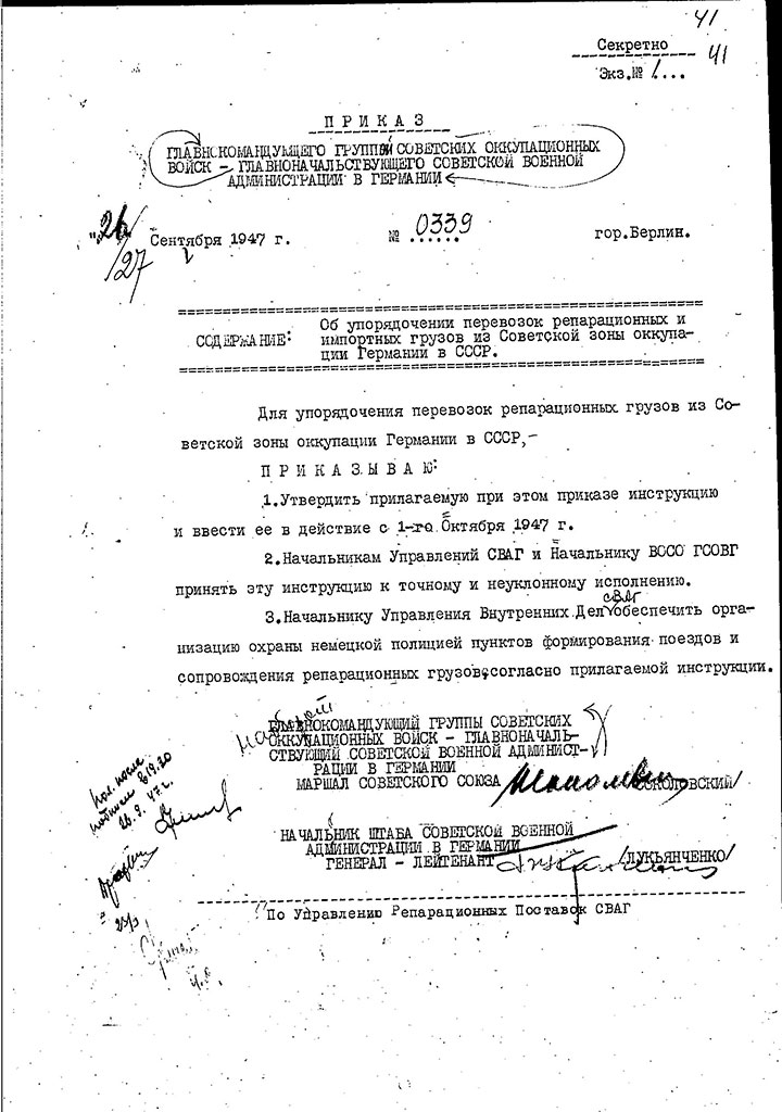 - • Приказ Главноначальствующего СВАГ № 0339 от 27.09.47 г. об утверждении Инструкции по обеспечению перевозок репарационных грузов из Советской зоны оккупации Германии в СССР и внутри зоны и инструкция. Подлинник. ГАРФ, ф. 7317, оп. 7, д. 50, лл. 41-48.