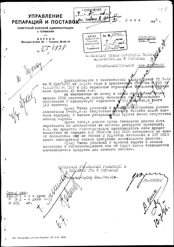 Однако начальника Управления репараций и поставок генерал-майора Л. И. Зорина, в чье распоряжение передавались батальоны, ожидало неприятное открытие: оба батальона поступили к нему с чудовищным некомплектом личного состава. Впрочем, как явствует из документов, для руководства СВАГ это сюрпризом не являлось, поскольку еще 15 июня заместитель начальника Штаба СВАГ генерал-лейтенант Г. С. Лукьянченко в своей докладной записке обращал на это внимание начальника Штаба ГСОВГ генерал-полковника М С. Малинина. В этой же докладной записке Лукьянченко просил отдать распоряжение Отделу укомплектования Штаба Группы «о выделении рядового и сержантского состава на укомплектование 107 и 125 отдельных стрелковых батальонов по сопровождению и охране репарационных грузов из Германии в СССР из частей Группы Войск за счет лучшего состава бойцов».